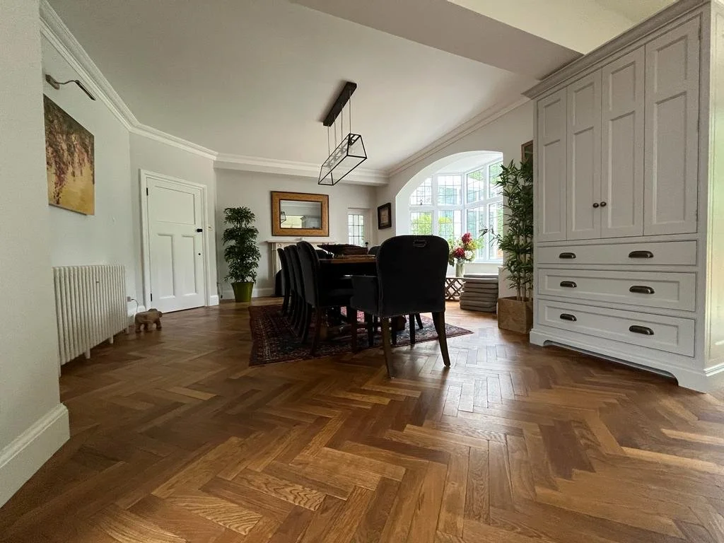 Embark on a journey of elegance and luxury with our full house refurbishment in Woldingham, Surrey. Immerse yourself in the beauty of parquet flooring, a loft extension with a wetroom toilet and bedroom, an exquisite hallway staircase, and captivating wood panelling.